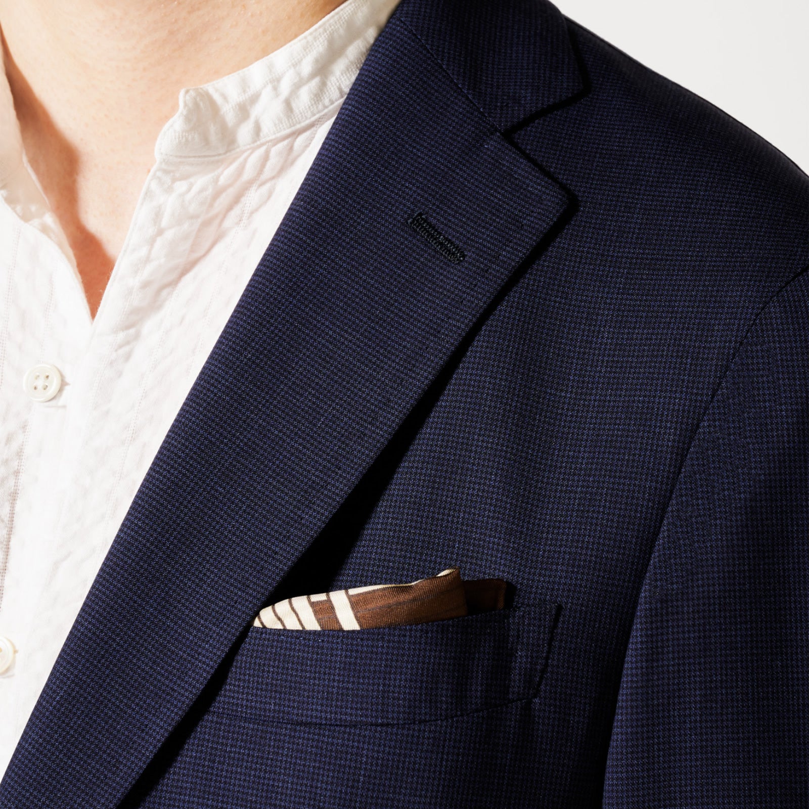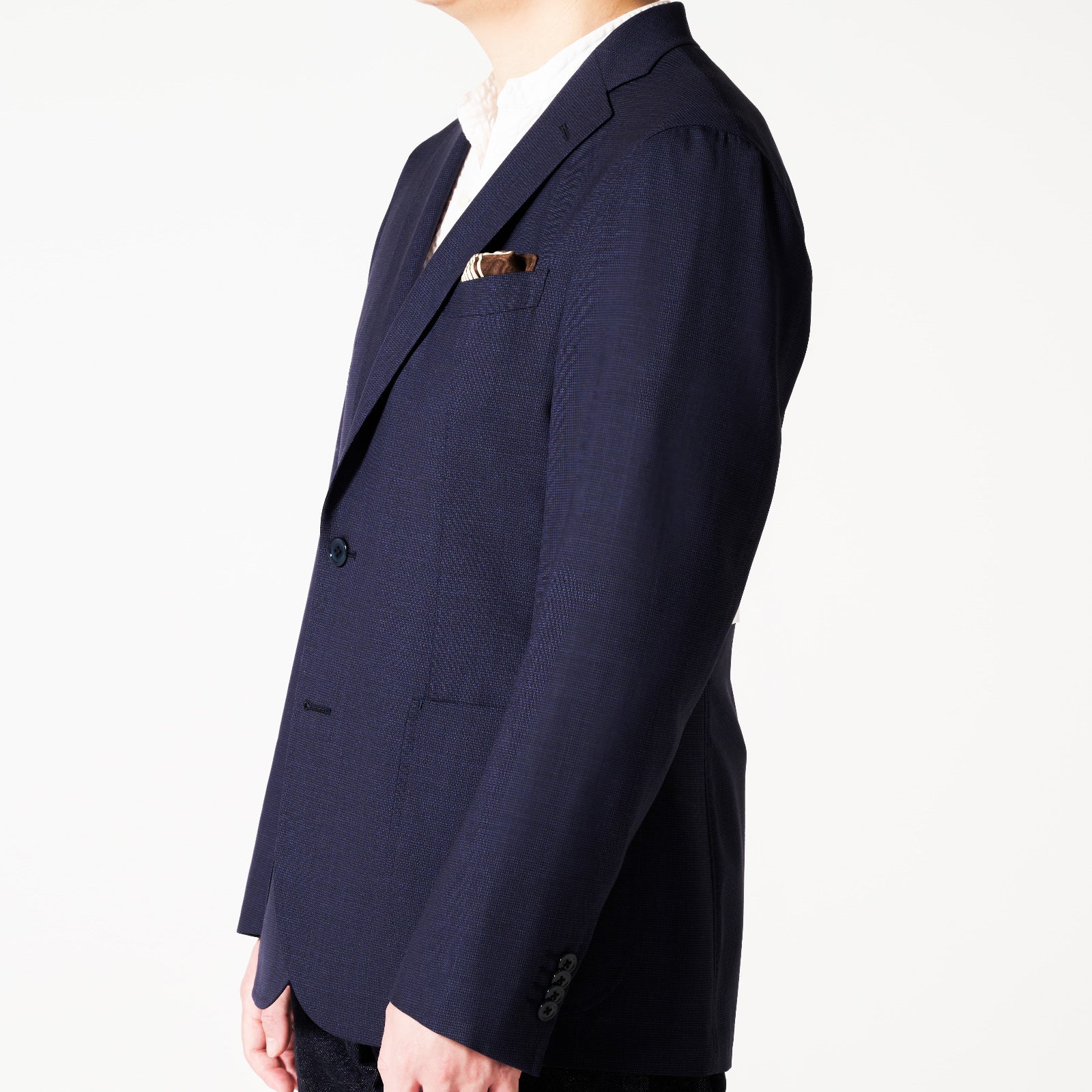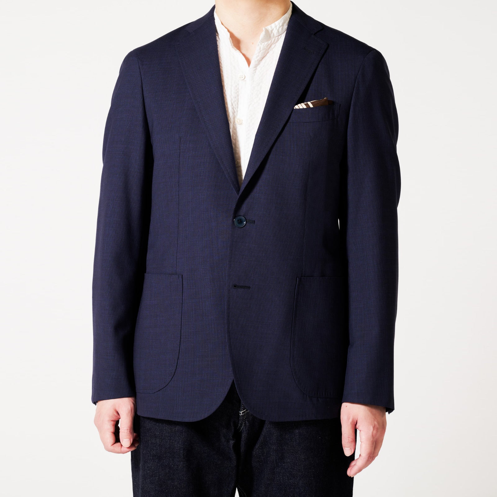 仕立てには極限まで軽量を追求するために新たなパターンを作成し、シャツジャケット仕様でありながら、下宮工場テーラリングで、立体的なシルエットを作り出しています。よく見ないとわからないくらい繊細なネイビーギンガムチェックのジャケットは、シャツスタイルだけでなく、カットソーやポロシャツなどとのコーディネイトも相性抜群です。
